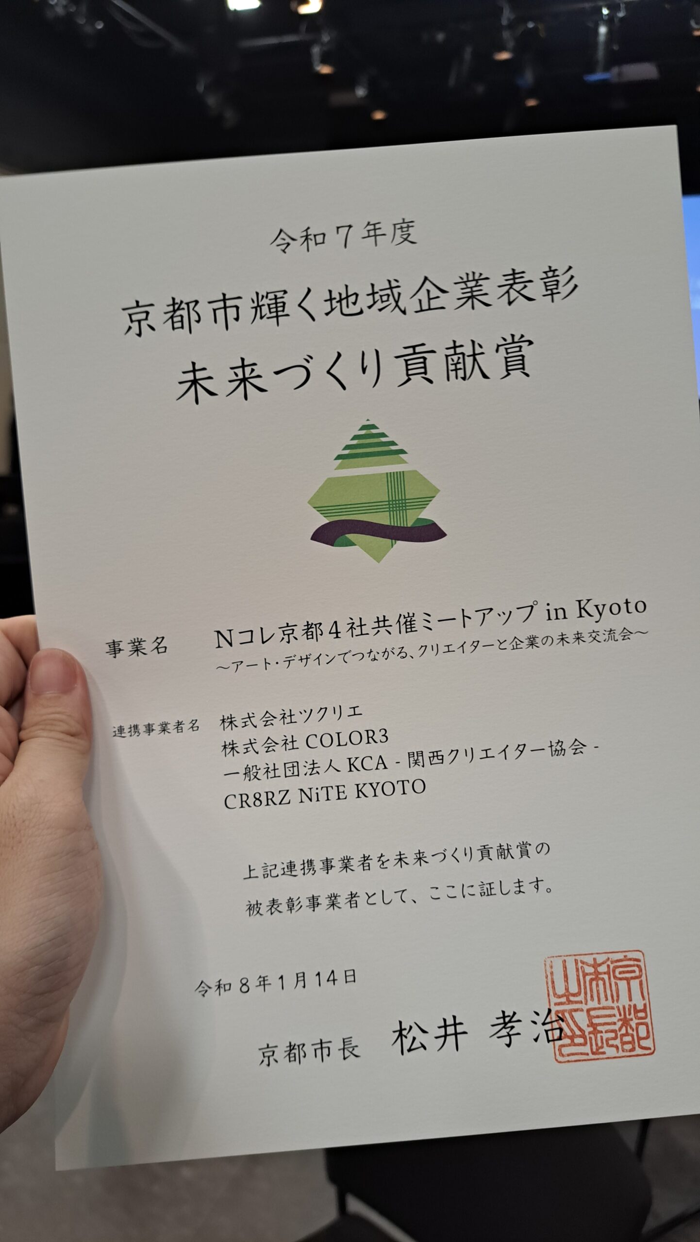 このたび、昨年9月に株式会社COLOR3、株式会社ツクリエ、CR8RZ NiTE KYOTO、そして一般社団法人KCAの4社共同で開催したイベント「Nコレ京都 4社共催ミートアップ in Kyoto」が、京都市が主催する「京都市 輝く地域企業表彰」において、「未来づくり貢献賞」を受賞いたしました!