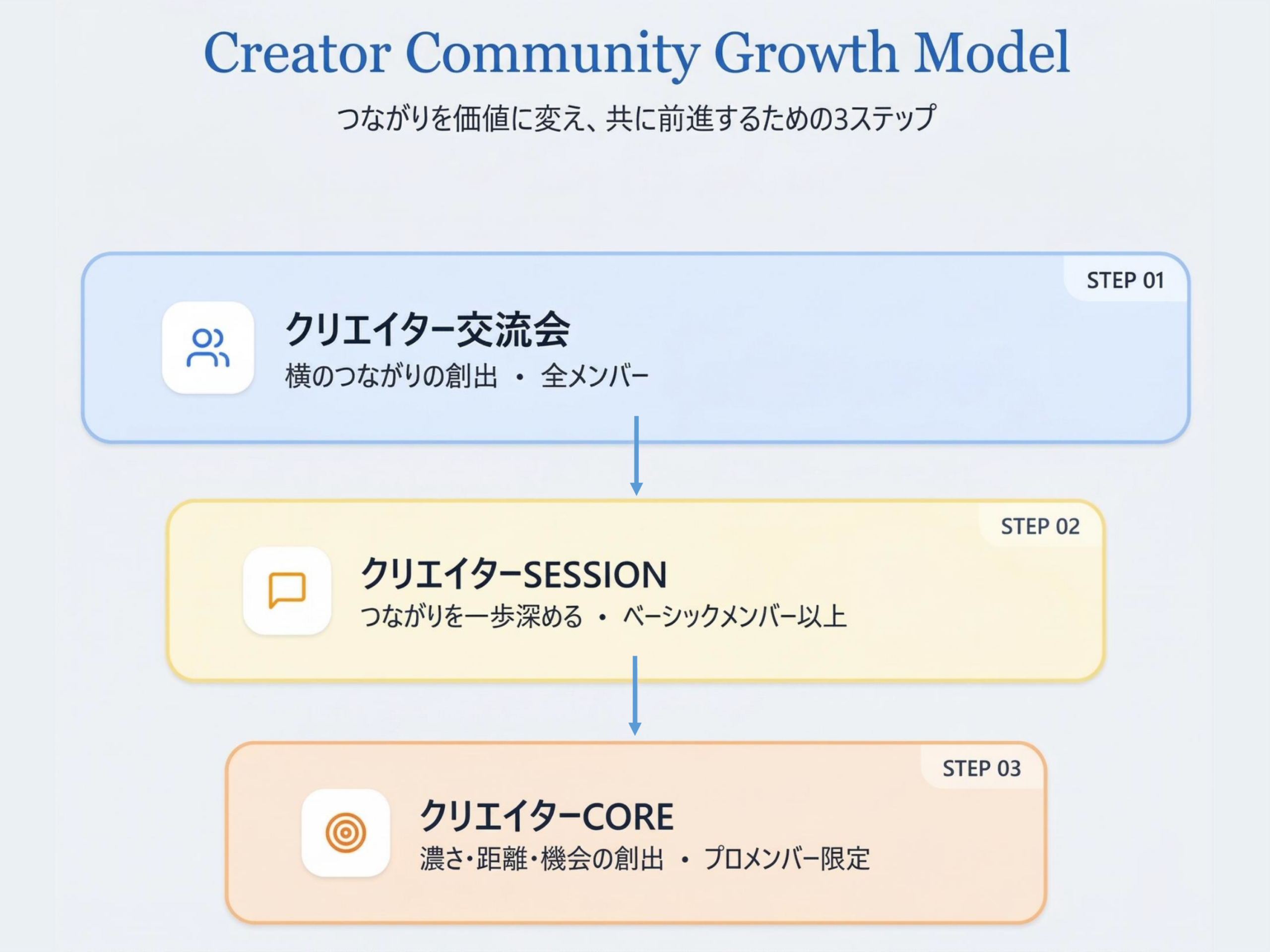 KCAではこれから、以下の3つのステップでクリエイターの成長とビジネス機会の創出をサポートしていきます。